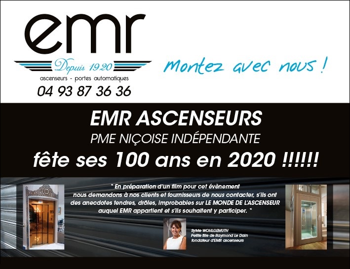 La société EMR ASCENSEUR et sa gérante Sylvie WOHLGEMUTH sont heureux de vous annoncer la sortie d'un film retraçant les 100 Ans de l'Entreprise en 2020.