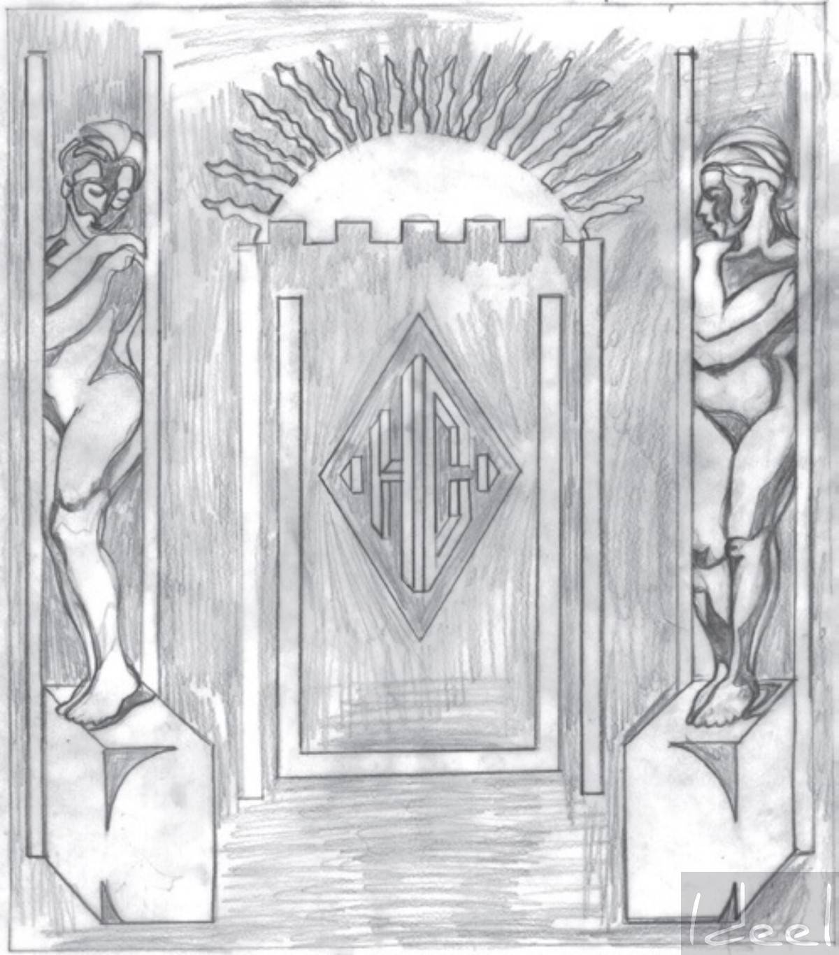 Entre deux colonnes, deux corps de femmes sont suggérés, à l'instar des sculptures antiques, elles apparaissent, légères, incomplètes.