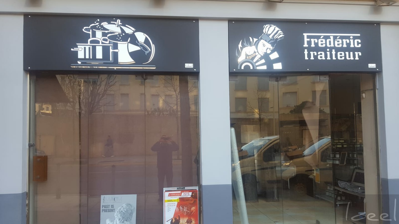 Pour la boutique d'un ami traiteur, Fred, boulevard Gambetta à Nice, des enseignes pas comme les autres, les illustrations sont réalisées à partir de la nature du caractère de fred: joie, bonne humeur, et surtout un coeur grand comme ca , qui déborde d amour jusque dans les plats qu il fait au quotidien