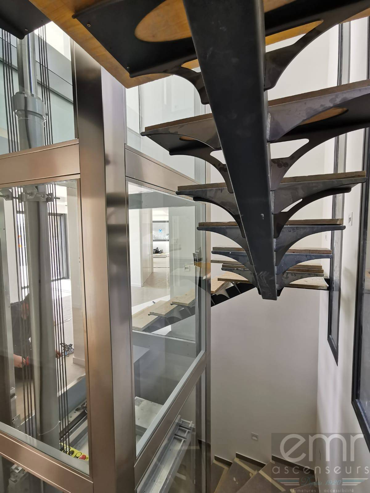 La structure métallique en inox est autoporteuse, l’armoire de manœuvre est non verrouillée ( toutes les sociétés d’ascenseur peuvent entretenir et dépanner ce type de matériel), les portes battantes sont manuelles avec un grand oculus, la cabine est panoramique avec un vitrage clair sur la paroi du fond et les faces latérales, le téléphone est aux Normes Handicapées et nous avons installé un kit GSM afin de minorer les factures téléphoniques et pour éviter l’installation d’une ligne téléphonique appelée à disparaître.