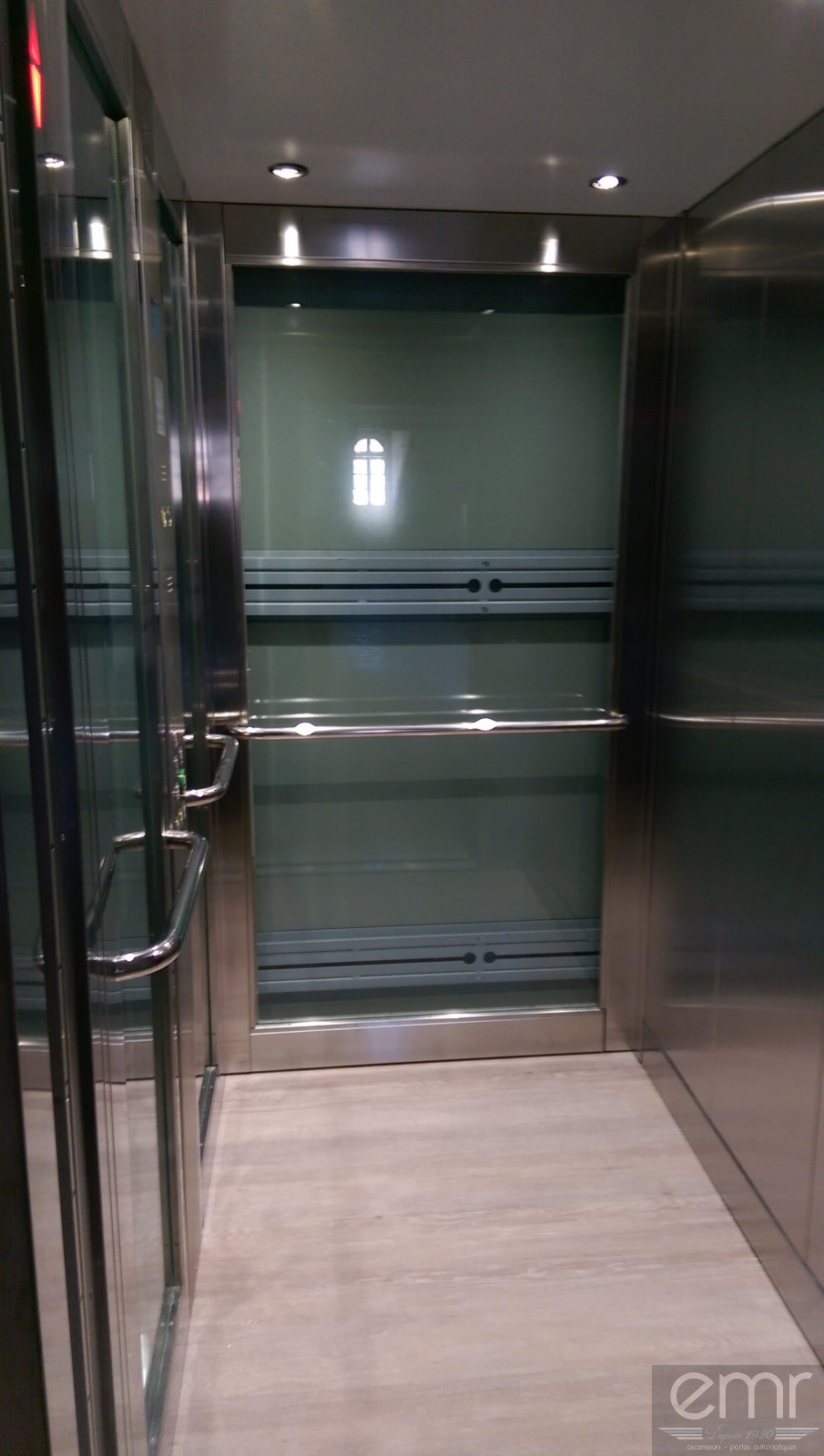 La cabine est également vitrée sur les 4 faces, les portes palières et cabine sont vitrées avec un encadrement en inox brossé.