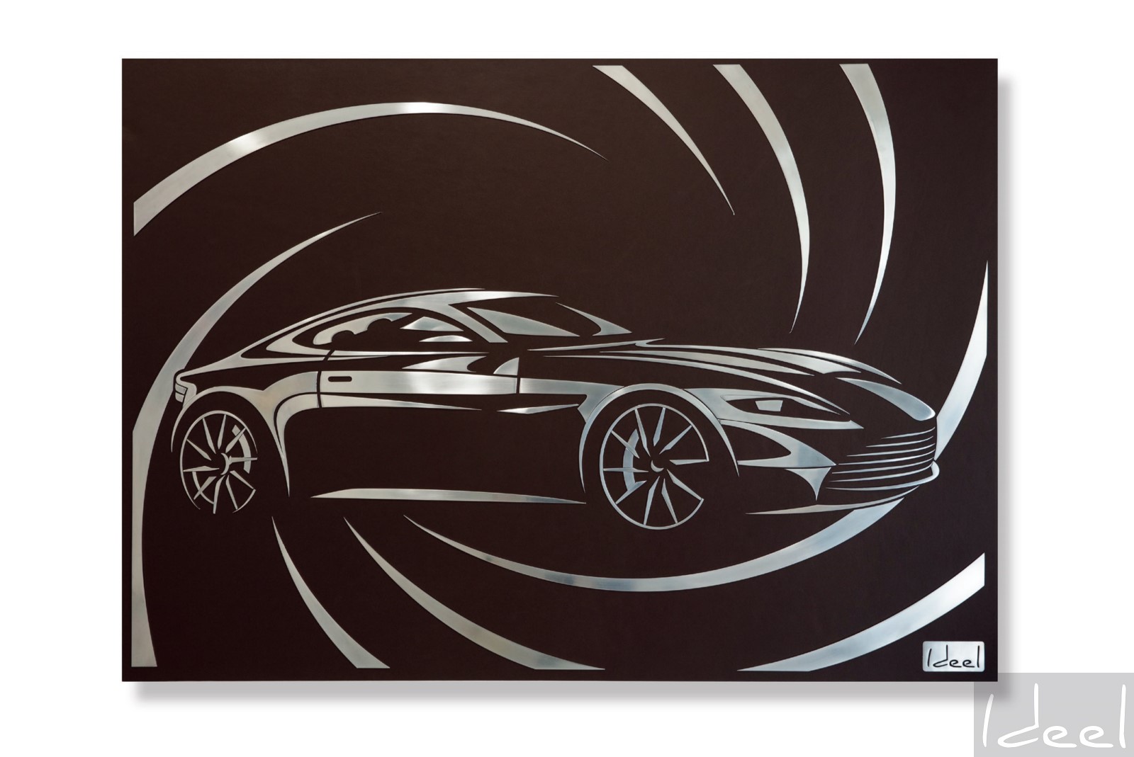 Acier sur cuir, le sigle de James Bond, revu et corrigé par mes soins, entoure le véhicule de légende telle une auréole, parfaitement British.