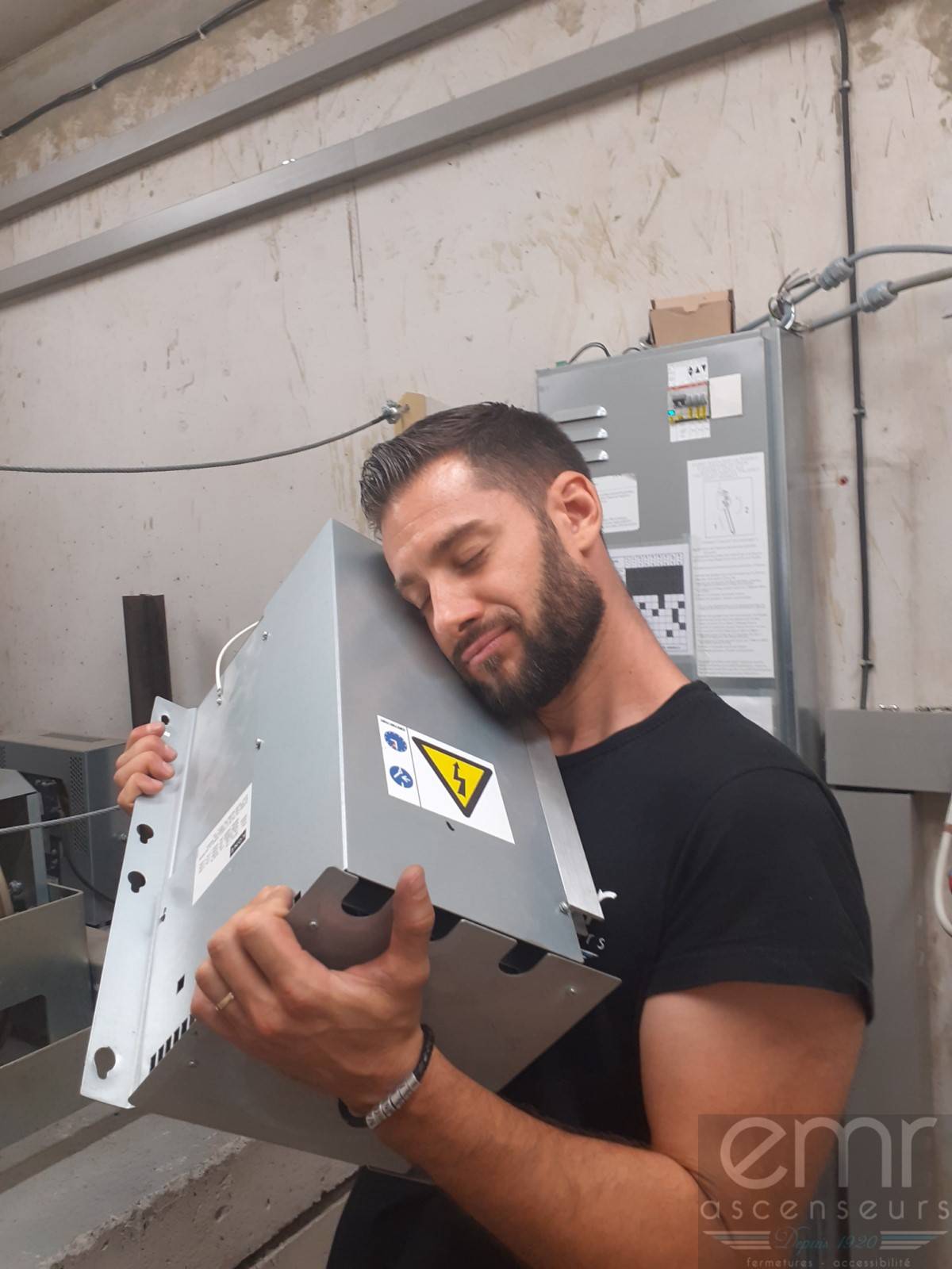 L’entreprise EMR ASCENSEURS qui existe sur la côte d’azur depuis 1920, est une entreprise particulière, ses techniciens, comme vous pouvez le constater, sont parfois amoureux de curieuses machines, comme sur cette photo, Cédric, tient dans ses bras, tout contre son cœur, une variation de fréquence toute neuve née en 2020 et installée au cœur de la Côte d’Azur, dans notre belle ville de Nice !