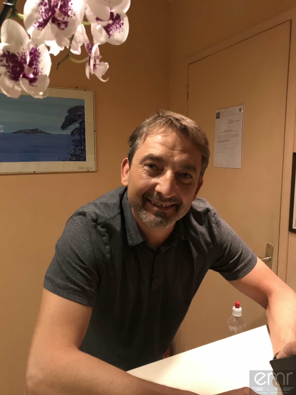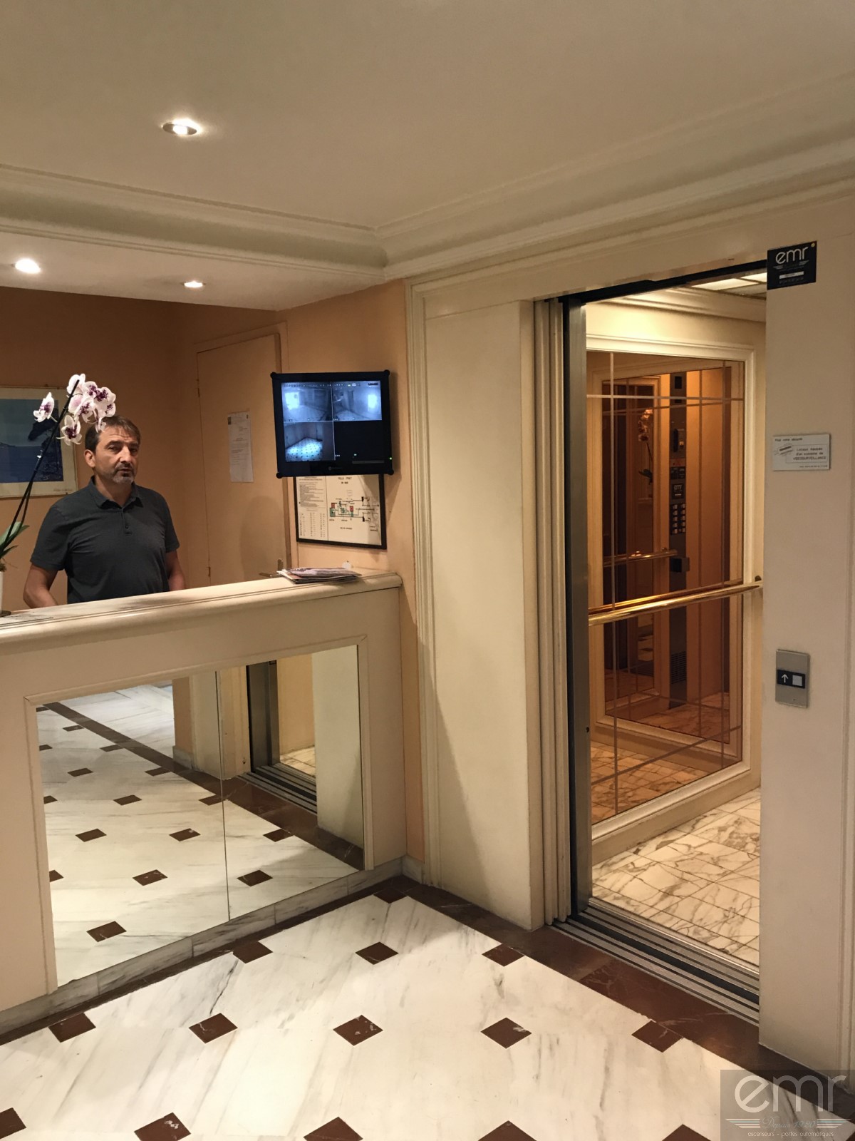 Face au comptoir le gardien de l'immeuble sourit à nos techniciens. La société EMR Ascenseurs et ses techniciens sont heureux de vous présenter un magnifique ascenseur dans une non moins magnifique Copropriété sur le bord de mer à Nice.