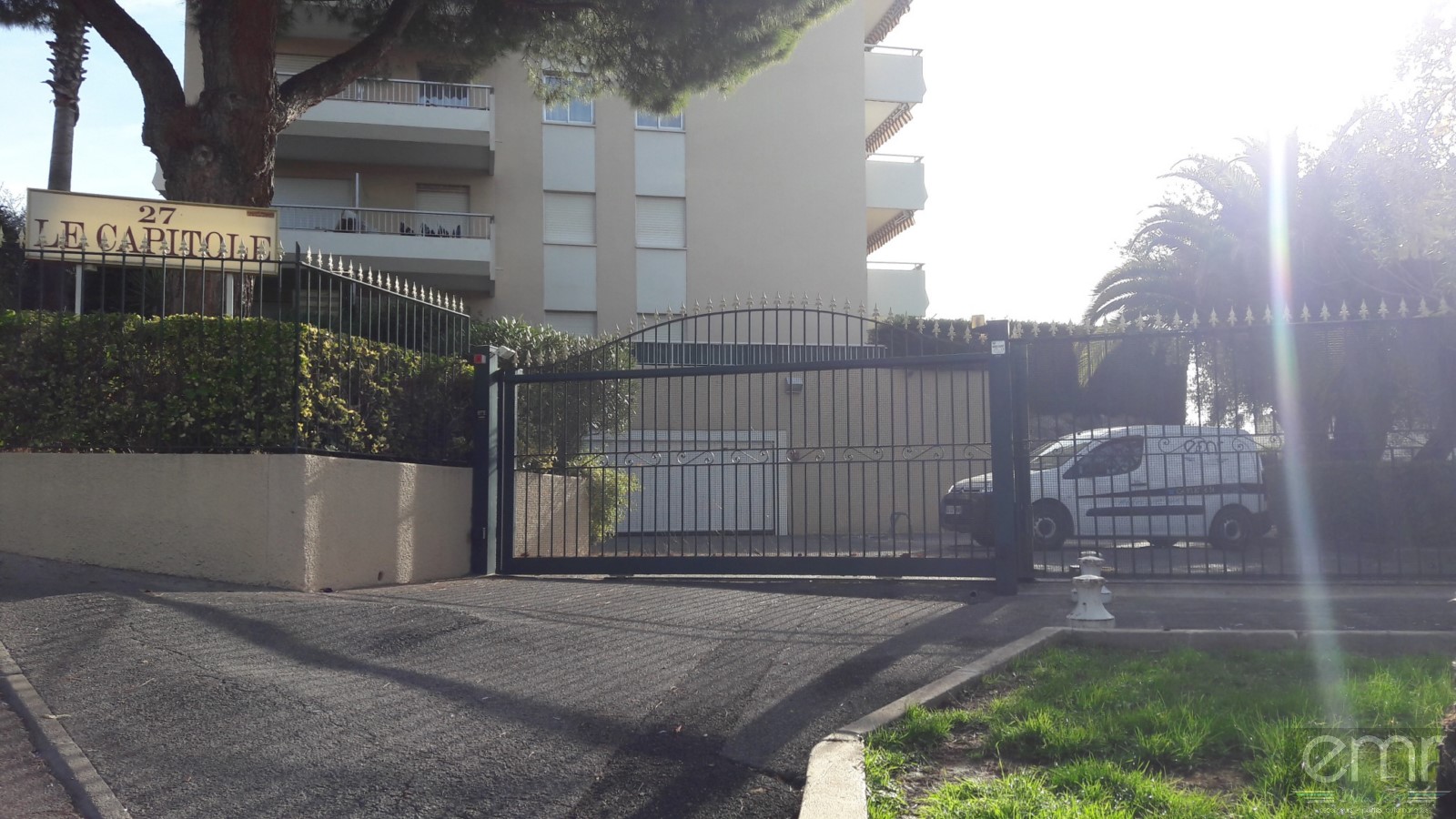 Entre pins et palmiers, le portail de la Copropriété s’intègre parfaitement sous le soleil.