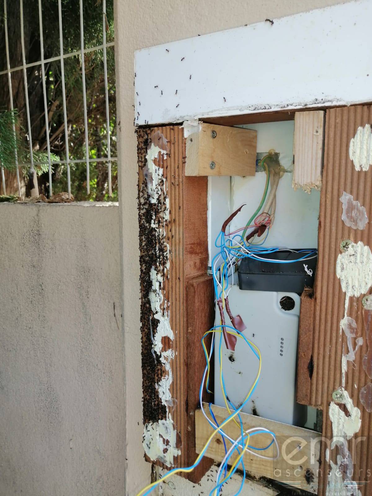 La réception des appels par les résidents ne se faisait plus. Le module GSM existant avait été installé derrière la plaque d’origine, notre technicien Emmanuel a remis en place un câblage fiable, évacué le nid de fourmis qui envahissait l’installation et supprimé l’ancien interphone. Après la reprise du câblage et le nettoyage complet du matériel, une nouvelle plaque inox a été installée.